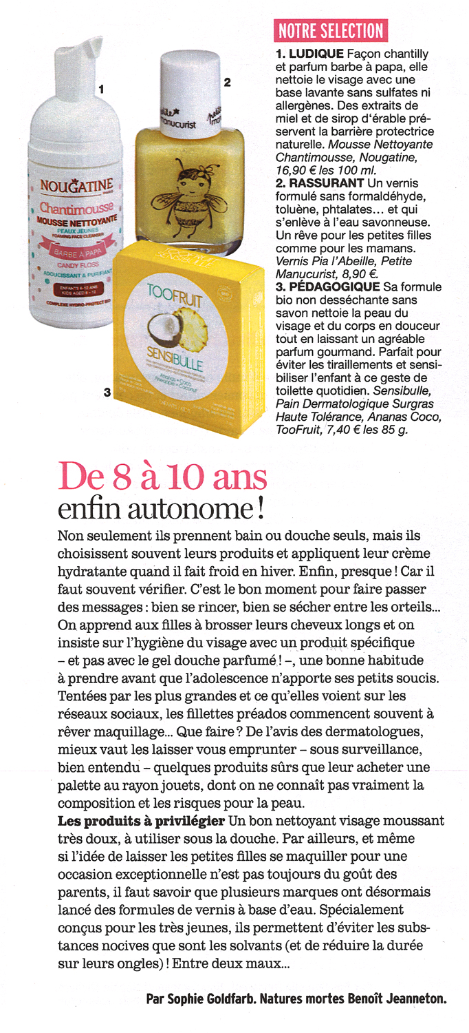 « RASSURANT. Un vernis formulé sans formaldéhyde, toluène, phtalates… et qui s’enlève à l’eau savonneuse. Un rêve pour les petites filles comme pour les mamans. »